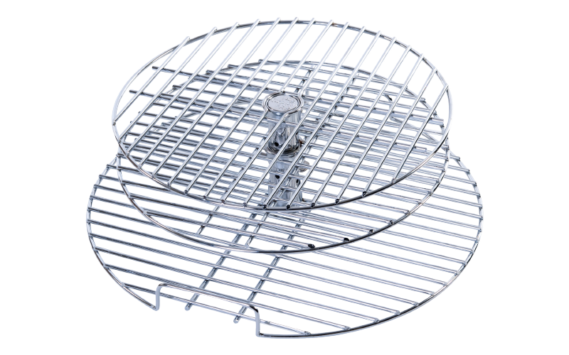 Přesně tak, jednotlivé části roštu můžete skládat i na sebe. Máte Big Green Egg Large a stále potřebujete více místa? 3-patrový rošt (3 Level Cooking Grid) z nerezové oceli vám umožní vařit rovnou ve třech úrovních naráz. Spodní rošt je pevný a zbylé dva rošty nad ním se dají otáčet a nastavit do libovolné výšky. S trochou prostorového vnímání tak můžete lehce naplnit lahůdkami až 3 poschodí.