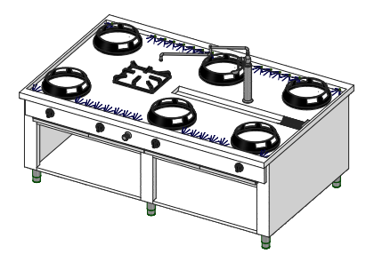 Atypický na přání zákazníka, vyrobený sporák se 6ti WOK plotny a 1 plotýnkou pro vaření vývaru.