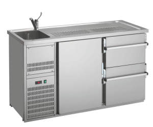 Chladící barové stoly RBPD / RBPS-120E, 112E a 104E jsou vyrobeny v celonerozovém provedení (AISI 304) s prolisovanou pracovní deskou, odkapní plochou (950 x 250 mm) a jednodřezem (300 x 500 x 300 mm) nad vestavěným agregátem, který je dle verze umístěn vpravo (D) nebo vlevo (S). Digitální ovládání s displejem, ventilované chlazení, automatické odtávání (připojení na odpad). Vybaveny hlubokými zásuvkami pro nápoje, nebo s dvířky (prostor pro Keg sud). Příplatkově lze doplnit prostor o vnitřní úložnou policí na nápoje a zámky dveří nebo zásuvek. Baterie ke dřezu a výčepní zařízení (pípa) není v ceně stolu.