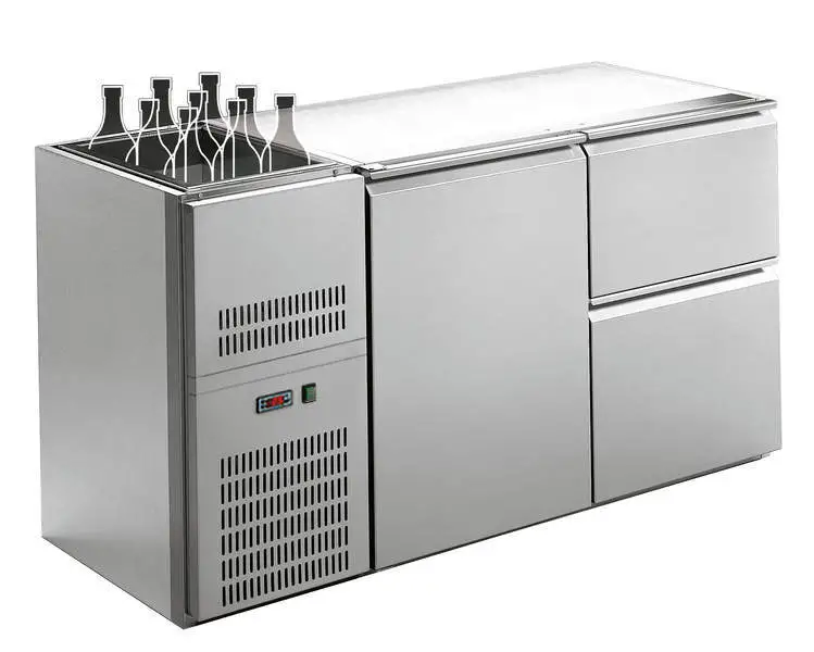 Chladící barové stoly s chlazenou vanou nad agregátem REGD / REGS-110E, 102E, 220E, 212E, a 204E jsou určeny pro vestavění pod barovou desku (V základu se zákrytem a krycím rámečkem chlazené vany - bez pracovní desky!), jsou vyrobeny v celonerezovém provedení (AISI 304) s vestavěným agregátem, který je dle verze umístěn vpravo a vlevo. Digitální ovládání teploty společné pro chlazený prostor a vanu (přípaltkově - STC - individuální ovládání teploty vany). Vnentilové chlazení, automatické odtávání (připojení na odpad), Vybaveny hlubokými zásuvkami pro nápoje, nebo s dvířky (prostor pro Keg sud). Příplatkově lze doplnit prostor o vnitřní úložnou polici na nápoje a zámky dvěří nebo zásuvek.