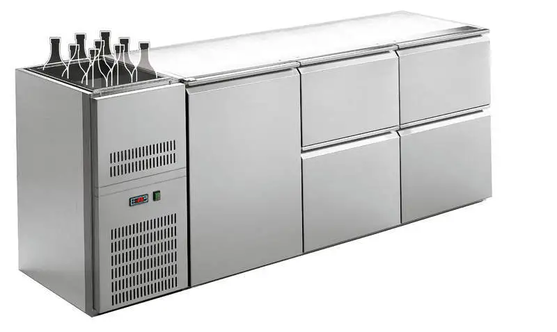Chladící barové stoly s chlazenou vanou nad agregátem REGD / REGS-330E, 322E, 314E a 306E jsou určeny pro vestavění pod barovou desku (V základu se zákrytem a krycím rámečkem chlazené vany - bez pracovní desky!), jsou vyrobeny v celonerezovém provedení (AISI 304) s vestavěným agregátem, který je dle verze umístěn vpravo a vlevo. Digitální ovládání teploty společné pro chlazený prostor a vanu (přípaltkově - STC - individuální ovládání teploty vany). Ventilové chlazení, automatické odtávání (připojení na odpad), Vybaveny hlubokými zásuvkami pro nápoje, nebo s dvířky (prostor pro Keg sud). Příplatkově lze doplnit prostor o vnitřní úložnou polici na nápoje a zámky dvěří nebo zásuvek.
