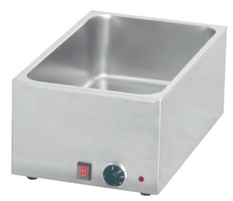 Model BM 1/1 165B: Elektrická vodní lázeň "Bain Marie" v nerezovém provedení 18/10 s lisovanou vanou vhodnou pro gastronádoby GN 1/1 - 150 (možnost vkládat jiné kombinace GN s maximální hloubkou 150 mm). Výkonné topné těleso s výkonem 1,2 kW, kvalitní termostat (možnost nastavit 5 pozic výkonu). Kontrolka chodu, regulační termostat a hlavní vypínač.