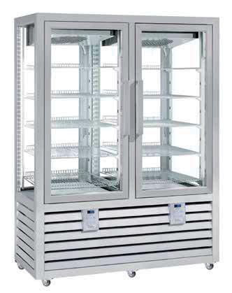 Dvojkřídlé, čtyřhranné mrazící vitríny s nuceným oběhem vzduchu, na pojezdových kolečkách s aretací pohybu, s vlhkostí vzduchu 40-75 %. Pevné roštové police, otočné kulaté police, nebo kombinace. Vitrína je rozdělená na 2 části.