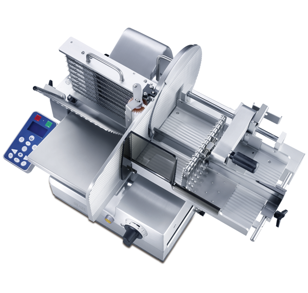 Nářezový plně automatický stroj pro profesionální použití na porcování a krájení produktů. Konstrukce stroje z eloxovaného hliníku jakož i vozík s ložnou plochou a plastová přítlačka. Bezpečné voděodolné ovládání s piezzoelektrickým odolnými spínači.