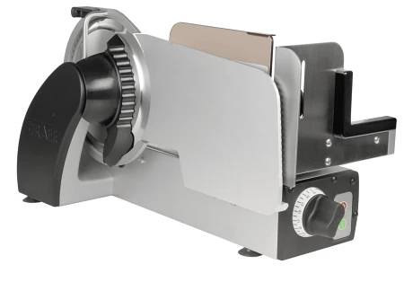 Nářezový stroj manuální pro profesionální použití na porcování a krájení různých produktů (uzeniny, maso, sýr, chléb, zeleninu a ovoce). Vhodný pro gastronomické provozy a menší prodejny. Opravdový multitalent se šírokým spektrem využití. Promyšlená konstrukce stroje zabezpečí nejlepší výsledky krájení, optimální přístup a komfort při čistění. Vysoký hygienický standard. Účinný systém chlazení motoru a hybridní pohon umožňuje efektivní a bezúdržbový přenos energie i při nepřetržitém provozu. Důmyslný "L" design umožňuje šikovnou kombinaci a těsné seskupení s úložnými tácky, krájecími deskami, nebo s váhou atd. Maximální řezná kapacita s minimální stopou, přesné a praktické nastavení tloušťky řezu od 0 až do 20mm. Vertikální provedení nářezového stroje, barva odolných plastů : černá (standardní), na objednávku v barvě (červená,bílá)