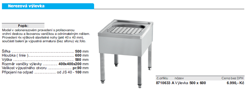 Nerezová výlevka 500 x 600 mmNa objednání do 10 dnů 1 ks10 008 Kč/ ks8 271 Kč bez DPH
