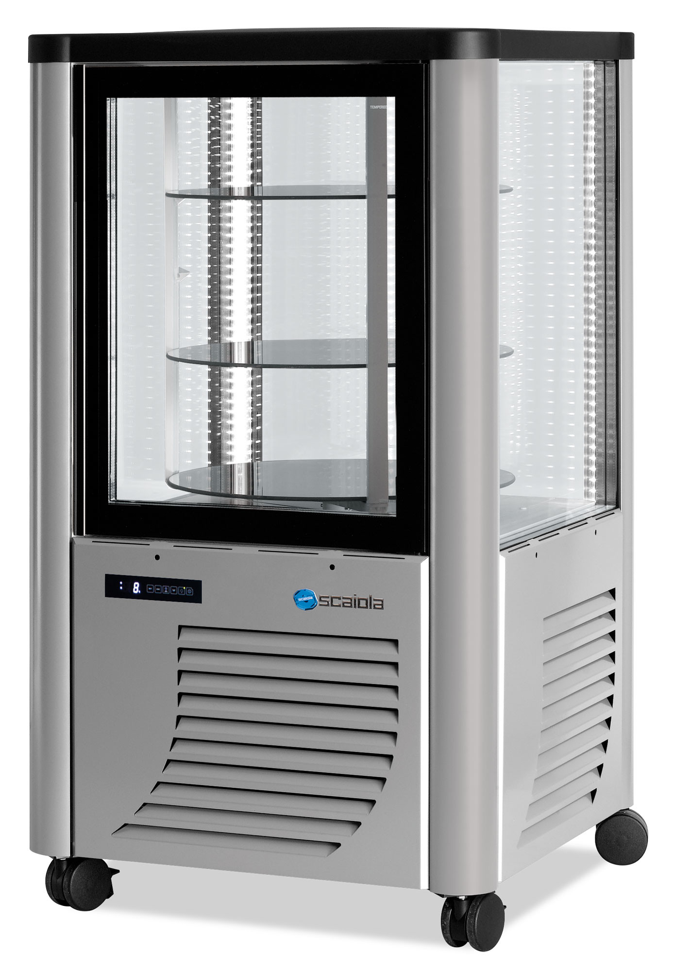 Panoramatická prosklená vitrína ERG 230 MA firmy Scaiola. Chlazení je zajišťováno nuceným oběhem s vlhkostí vzduchu 80 - 90 %. Skleněná vitrína disponuje 3 rošty o objemu 230 litrů a teplotním rozsahem +2 až +10 °C. Okolní teplota: do + 33 °C. Vitrína obsahuje systém automatické odtávání a odpařování vody. Osvětlení prostoru pomocí LED diod. Vícevrstvé sklo je nemlživé.