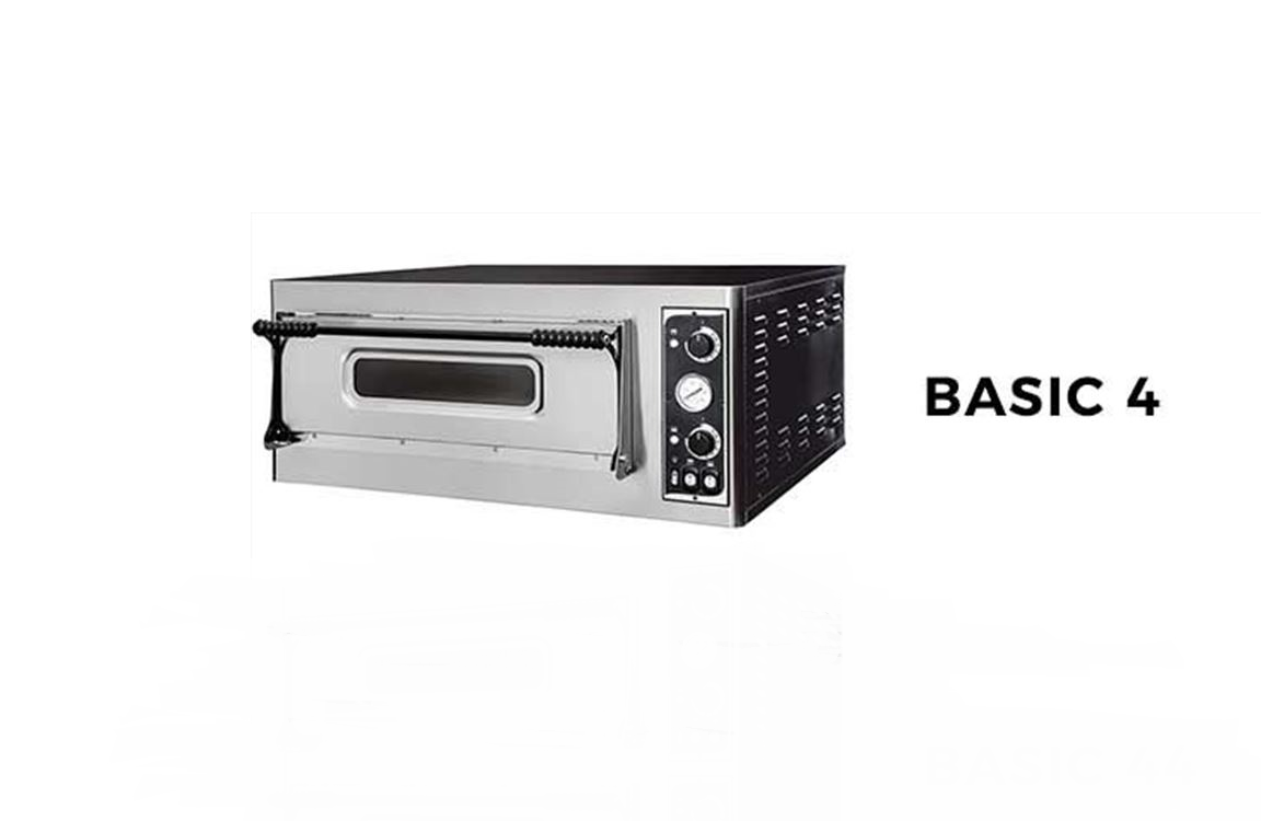Modely BASIC 4 - jednokomorová elektrická pizza pec řady BASIC. Snadné a přehledné mechanické ovládání umožňuje individuální nastavení výkonu spodních a horních těles v komoře případně vypnutí spodního, nebo horního tělesa. Pec je vybavena analogovým teploměrem a termostatem do 500 °C. Kvalitní izolace, šamotové dno, nerezové provedení dveří a čela. opláštění laku, osvětlení komory.